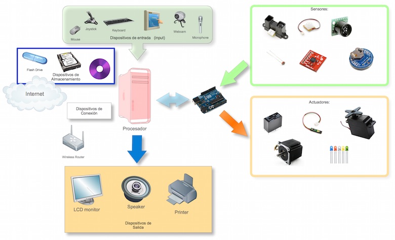 Diagrama que muestra algunas posibilidades de conexión de dispositivos de entrada y de salida en un sistema de cómputo. Se muestran también dispositivos de almacenamiento y de conexión.